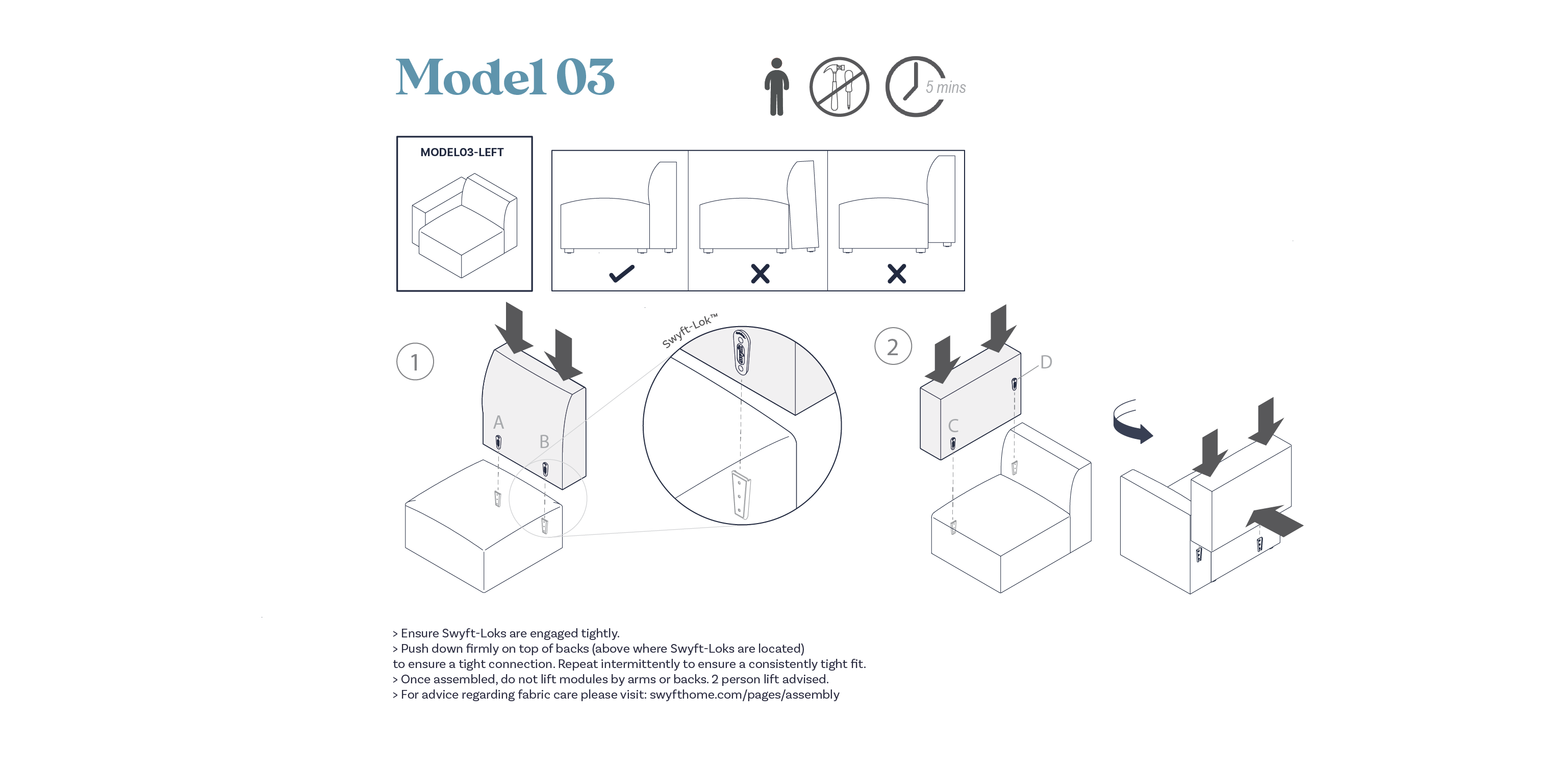 The modules are kept separate and don’t use the Swyft-lok technology to lock together, this is so you have the flexibility of movement and transformation of your space. They also come with rubber feet which creates suction and stops the modules from moving.