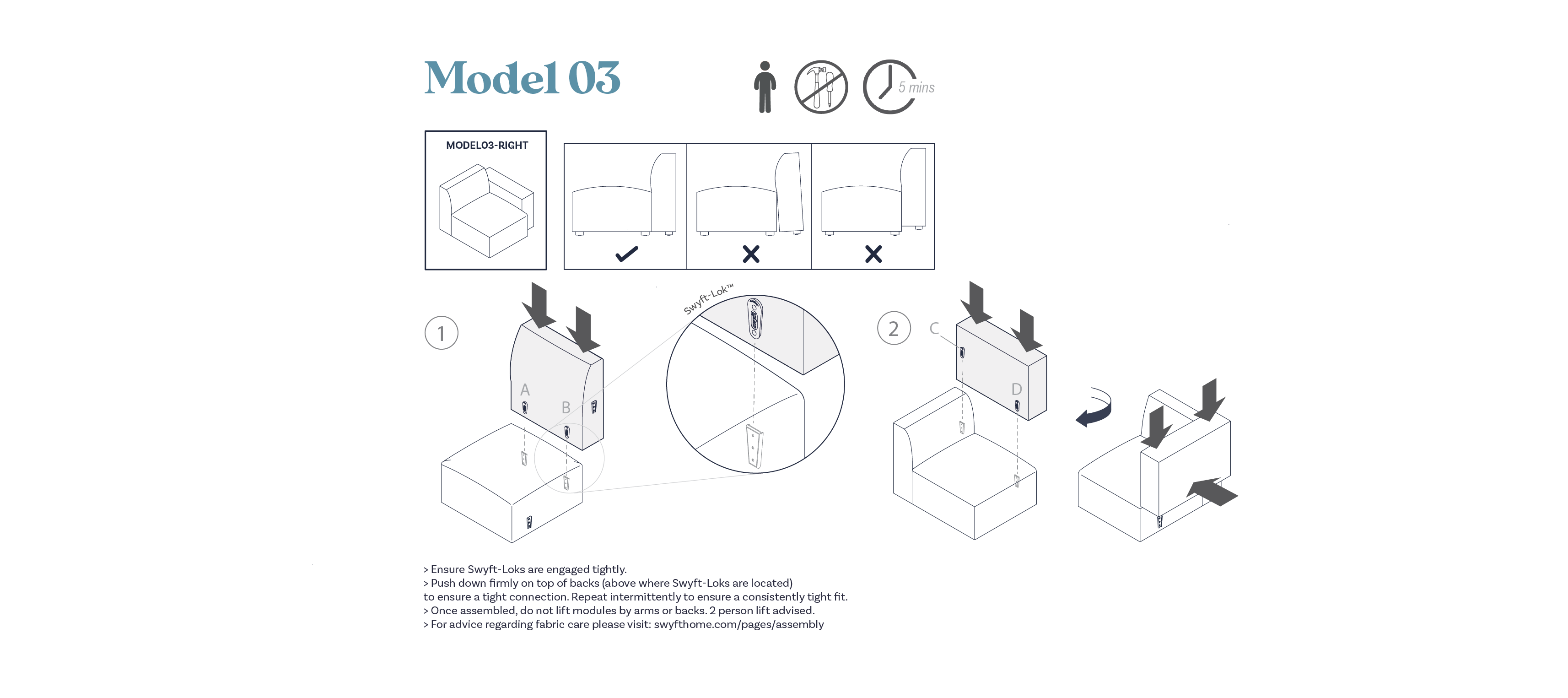The modules are kept separate and don’t use the Swyft-lok technology to lock together, this is so you have the flexibility of movement and transformation of your space. They also come with rubber feet which creates suction and stops the modules from moving.